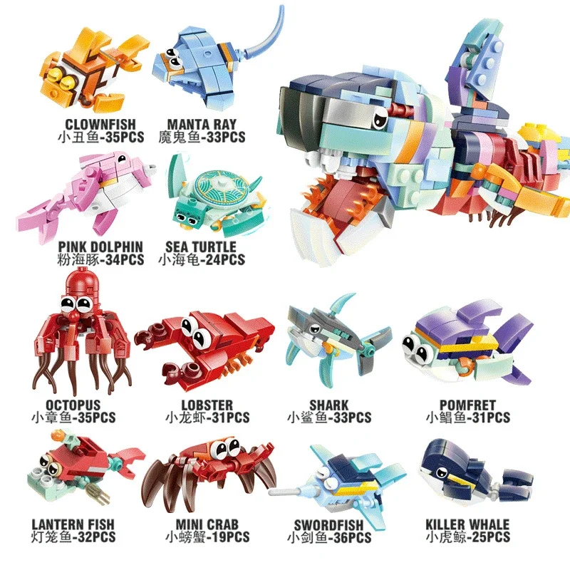 Creative Expert Mini Ocean Animal Model Building Block12 In 1 Shark Octopus Crab Bricks Educational Toys Birthday Gift for Kids