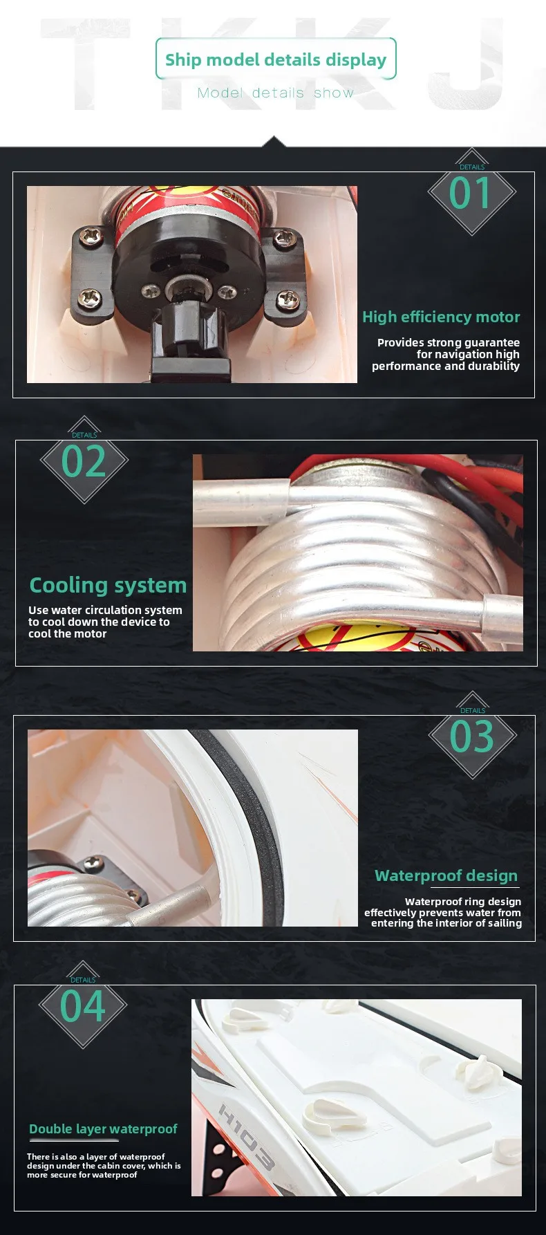 Product details: Remote control boat * 1, remote control * 1, lithium battery * 1, charging cable * 1, wrench * 1, display stand * 1 set, lubricant * 1, spare propeller * 1, nut * 1, instruction manual * 1.