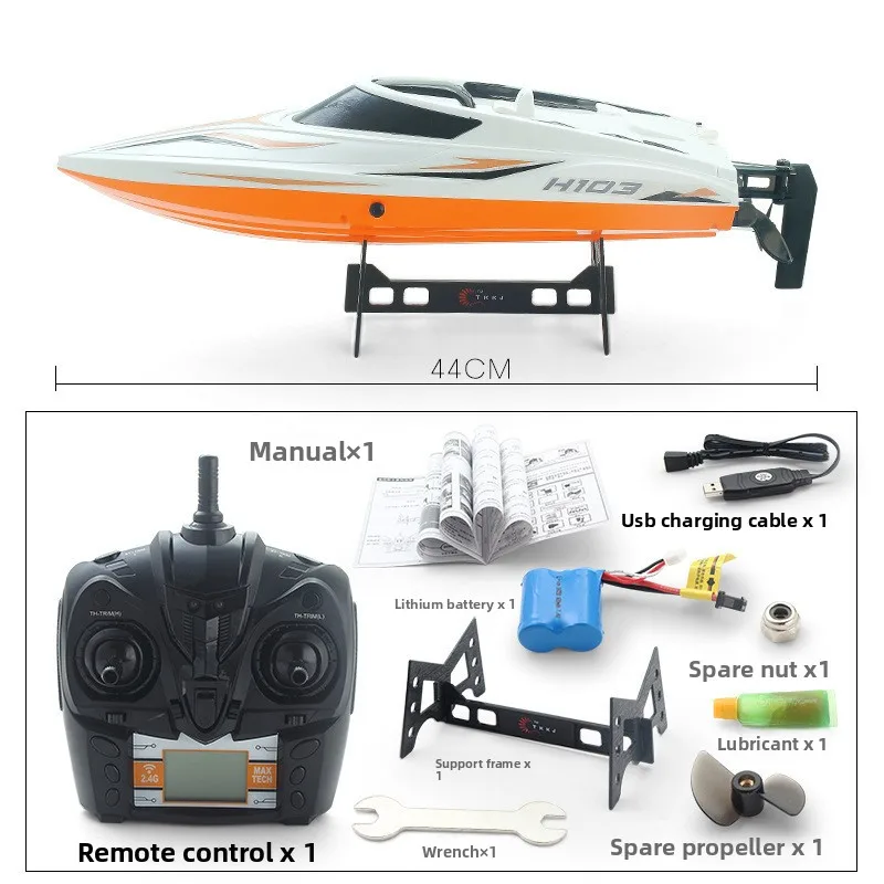 Product details: Remote control boat * 1, remote control * 1, lithium battery * 1, charging cable * 1, wrench * 1, display stand * 1 set, lubricant * 1, spare propeller * 1, nut * 1, instruction manual * 1.