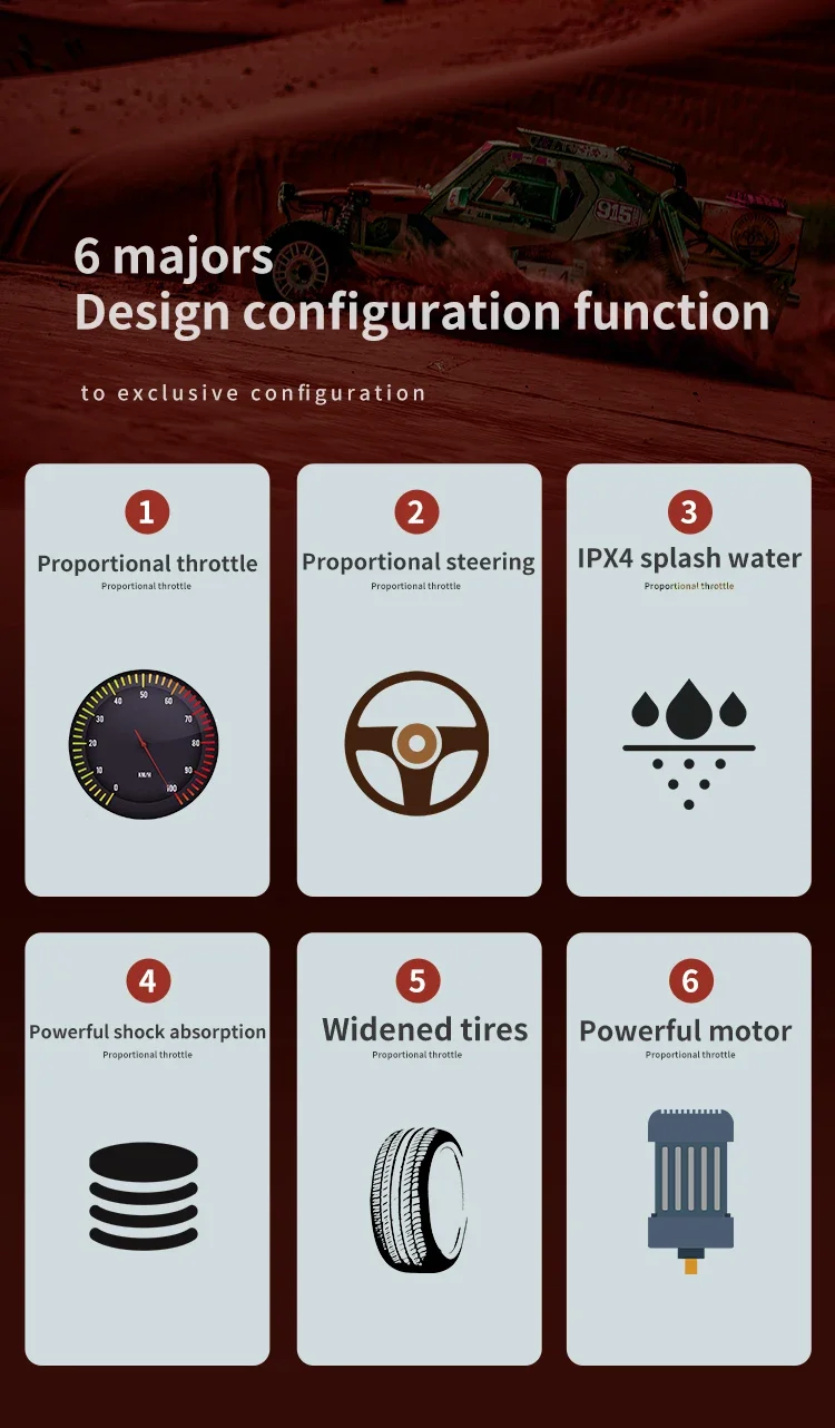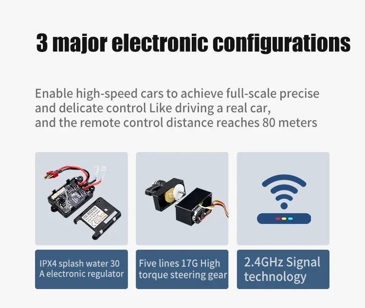 4, 2.4G full scale synchronized remote control system . Full ratio throttle/steering;