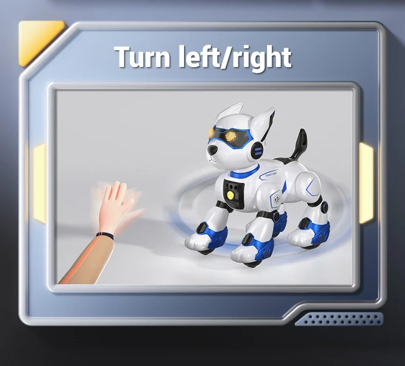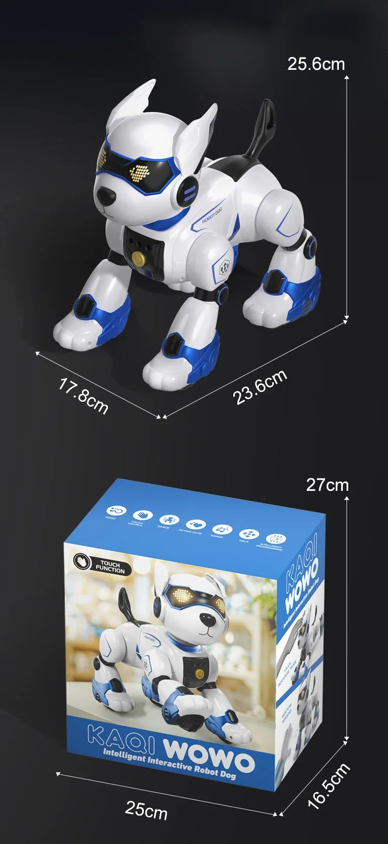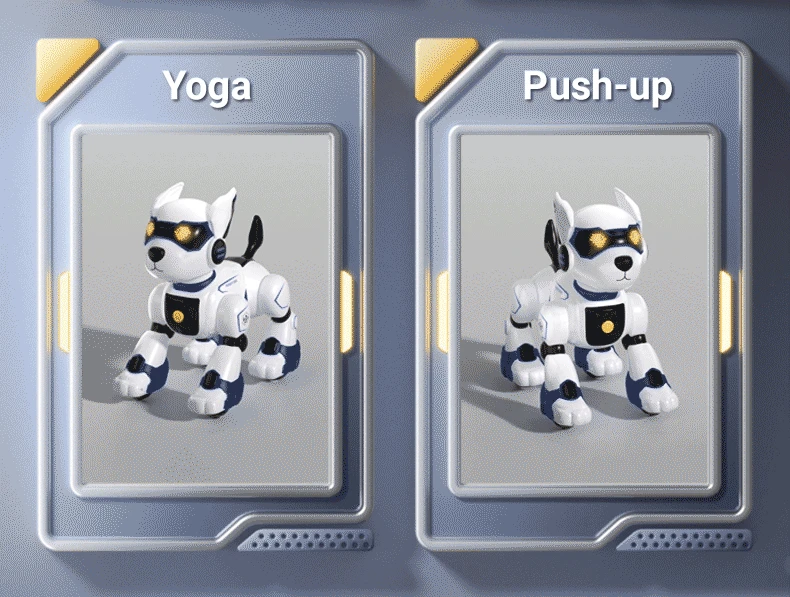 #Say hello, sit down, and please perform stunts,Handstand rotation and flip action,Push-up exercises,Cute stunts,Smart touch sensor interactive funny dog mode,Intelligent marching follow,Simulate a smooth and changeable stunt music and dance combination.